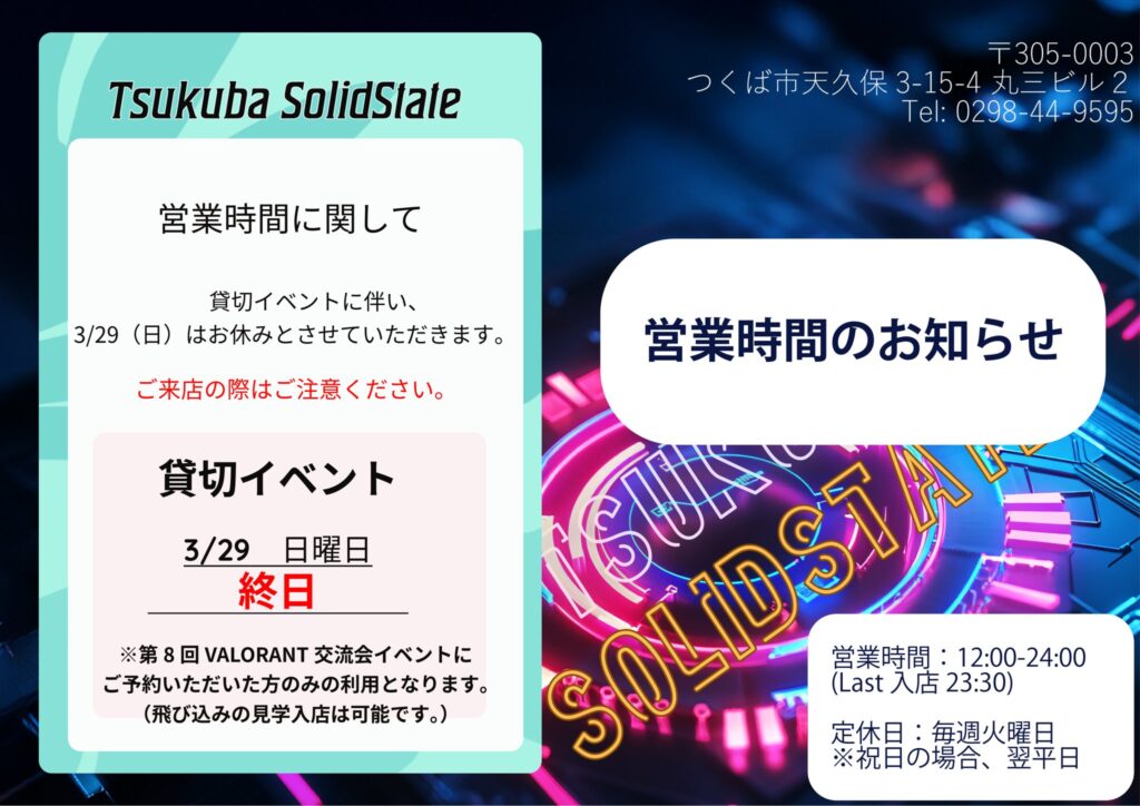 3月29日(日)は、終日貸切です! 投稿公開日:2026年3月28日 投稿カテゴリー:お知らせ 第8回VALORANT交流会の事前予約頂いた方のみご利用可能です。イベント詳細につきましては画像をご覧ください。 また、イベント参加者の方は12時半より入店開始・受付になります。 よろしくお願い致します🙇♀️ おすすめ 高速回線の導入が完了しました! 2025年4月16日 LANパーティーの料金表公開! 2025年11月25日 新プラン登場!「LIMIT BRAKE12h」 2026年3月1日
