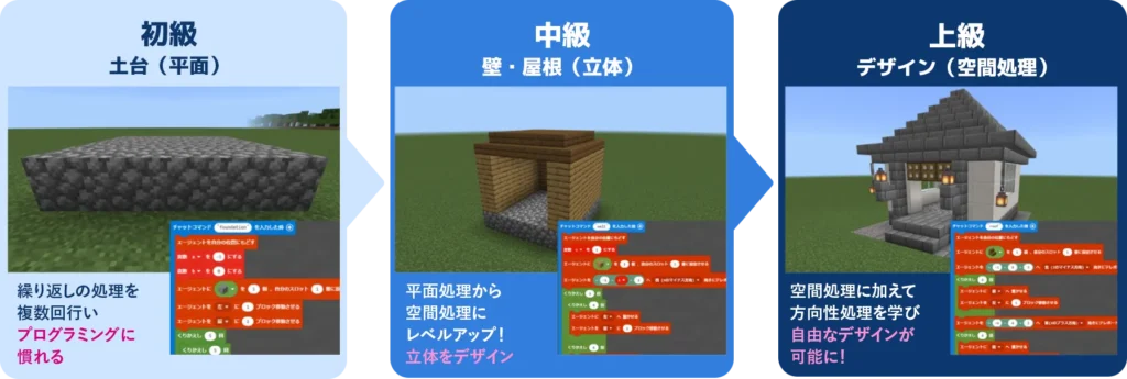 お子様のレベルに合わせたプログラミング教育を行います。マイクラが好きなお子さまに最適な学びの場です。